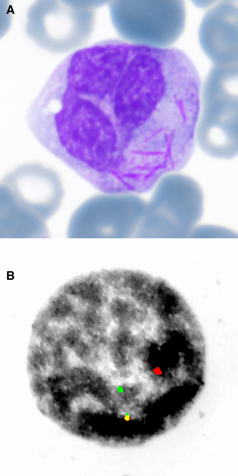 A 55-year-old man with agranulocytosis was diagnosed with acute myeloid leukemia (AML). Atypical eosinophil granulocytes with large basophil but also small pale, structureless granules were observed, and cells with Auer rods in maturing granulopoiesis were noticed in the bone marrow. Panel A shows a mature granulocyte in peripheral blood with many Auer rods in cytoplasm (Pappenheim stained peripheral blood smear, 1000x; Supplementary Material). Auer rods were visible in the peripheral blood in 8% (4/50) of the mature granulocytes. Panel B shows fluorescence-in-situ-hybridization with inversion 16 [inv(16)(p13q22)] in a bone marrow blast due to rearrangement (split; red and green) of a CBFB copy (1000x) (Fig. 1).
