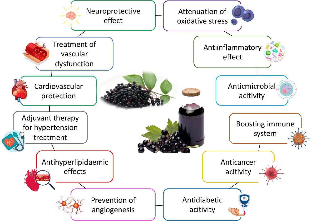 This review examined current evidence and discussions about the health-related effects of black elderberry, which contains many biologically active components such as polyphenols, phenolic acids, flavonols, proanthocyanidins and anthocyanins, as well as terpenes and lectins, and offered some suggestions on its use in the future.