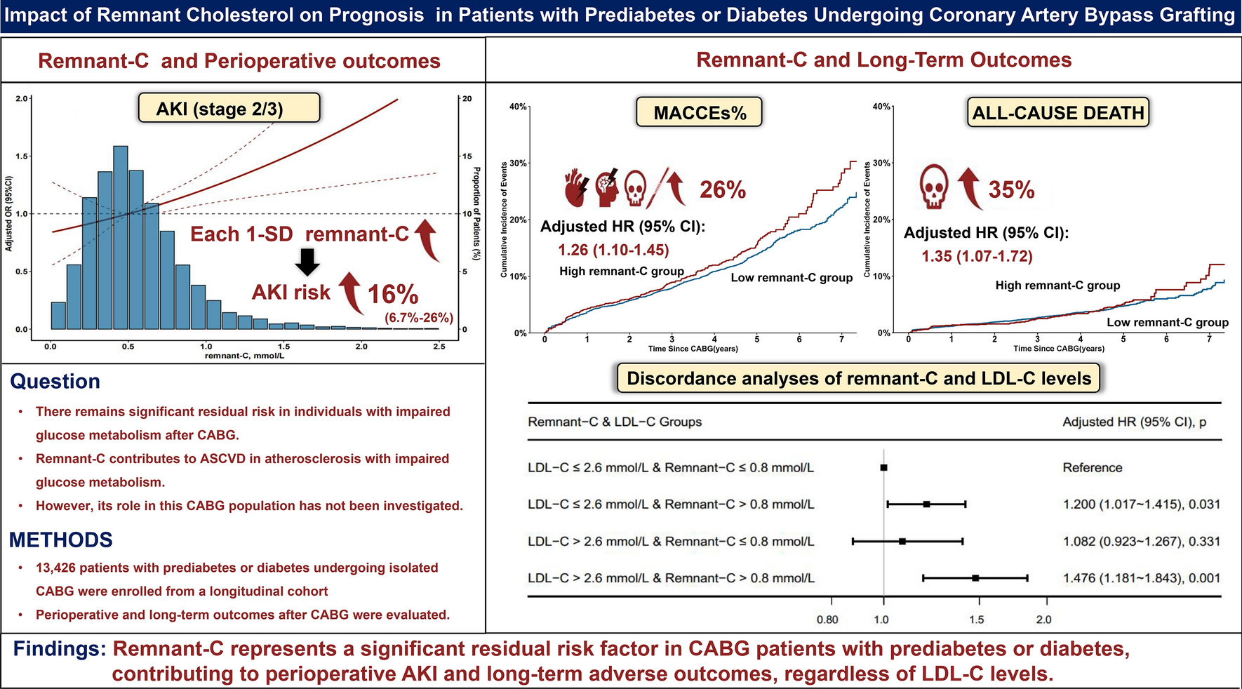 Remnant cholesterol (Remnant-C) may be an important risk factor for patients with impaired glucose metabolism undergoing coronary artery bypass grafting (CABG), however its role remains unknown. In our study, 13,426 CABG patients with prediabetes or diabetes were enrolled from a large longitudinal cohort to assess the impact of remnant-C on both perioperative and long-term outcomes. We found that higher remnant-C levels were significantly associated with an increased risk of acute kidney injury (AKI) perioperatively, as well as long-term adverse outcomes, including major adverse cardiovascular and cerebrovascular events (MACCEs), independent of LDL-C levels. HR, hazard ratio; CI, confidence interval; SD, Standard deviation; remnant-C, remnant cholesterol; MACCEs, major adverse cardiovascular and cerebrovascular events; CABG, coronary artery bypass grafting.