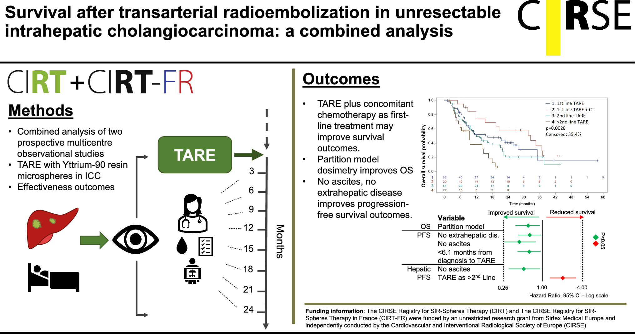Transarterial radioembolization (TARE) with Yttrium-90 resin microspheres is a treatment option for patients with intrahepatic cholangiocarcinoma (ICC). However, optimising the timing of TARE in relation to systemic therapies and patient selection remains challenging. We report here on the effectiveness, safety, and prognostic factors associated with TARE for ICC in a combined analysis of the prospective observational CIRT studies (NCT02305459 and NCT03256994).