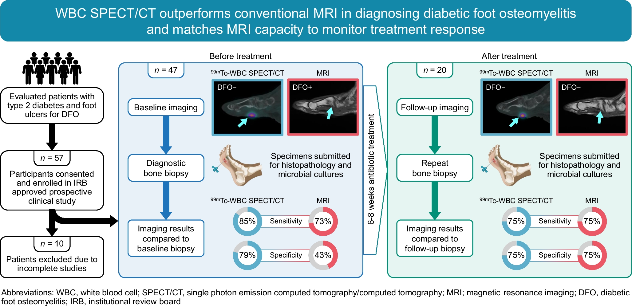 In this prospective clinical study, 47 patients with foot wounds suspicious for DFO underwent 99mTc-WBC SPECT/CT and MRI, followed by bone biopsy. After receiving a standard course of antibiotics, 20 patients returned for post-treatment imaging and a repeat biopsy. All imaging studies and histopathology were blindly interpreted as positive or negative for DFO. Biopsies were considered positive if either bone cultures or histopathology indicated osteomyelitis. Imaging results were evaluated against biopsy to determine the diagnostic performance of each method before and after treatment.