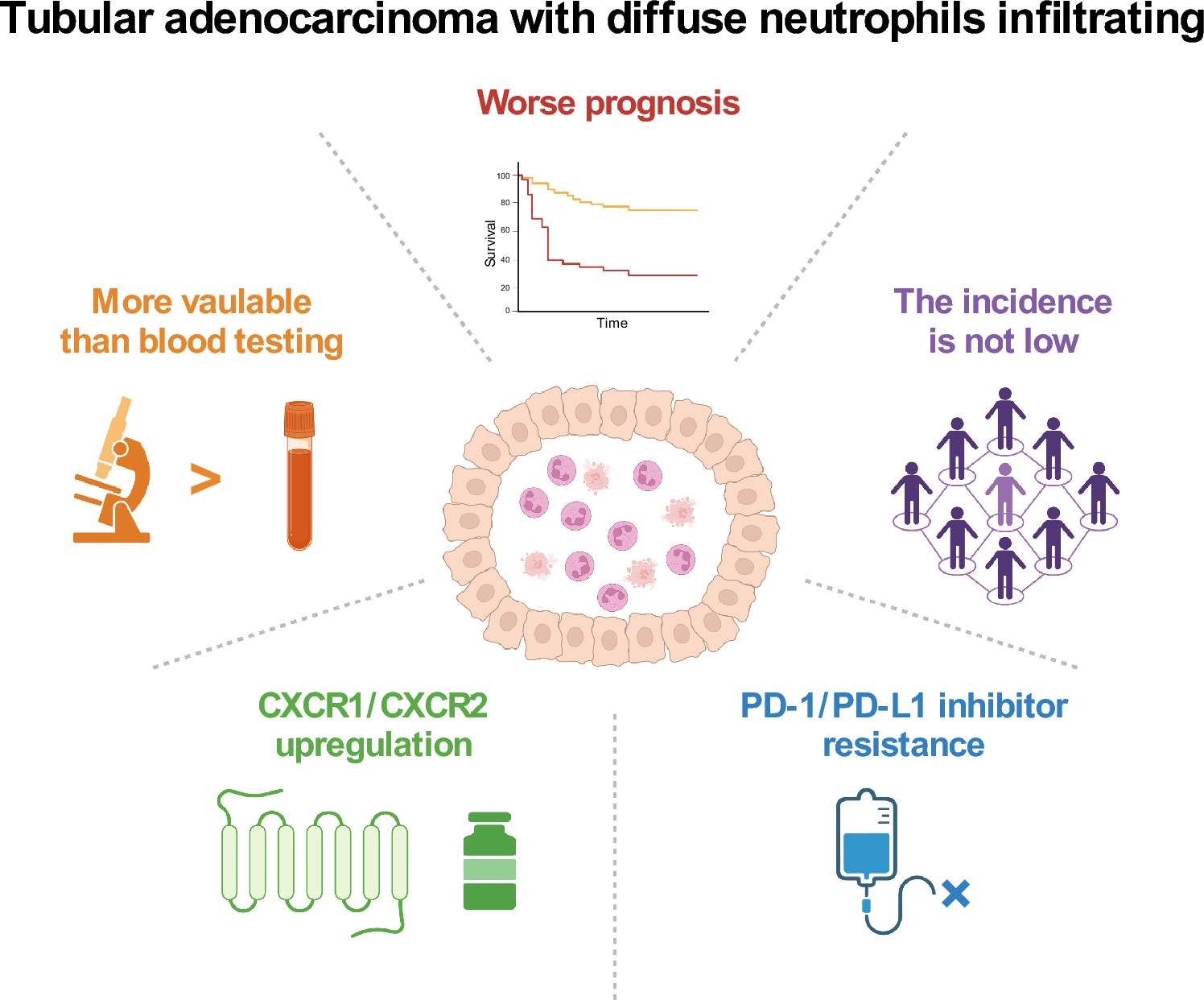 Gastric adenocarcinoma is a highly heterogeneous malignancy with varying prognoses. In clinicopathological practice, we noticed a special tubular adenocarcinoma with diffuse neutrophils infiltrating (TADNI). However, the proportion and characteristics of TADNI remain unclear. This study aimed to evaluate the features of TADNI and explore probable treatments.