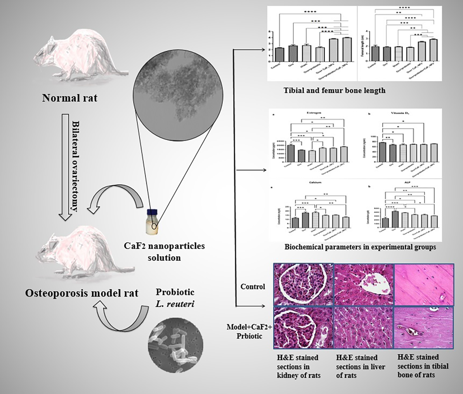 In this study, 18 matured Wistar female rats were randomly assigned into 6 groups, including control, OVX, sham, OVX + L. reuteri, OVX + CaF2 NPs, and OVX + L. reuteri + CaF2 NPs. We used OVX rats to simulate post-menopausal osteoporosis, and the treatments were begun two weeks before OVX and continued for four weeks. All groups’ blood samples were collected, and serum biomarkers (estrogen, calcium, vitamin D3, and alkaline phosphatase (ALP)) were measured. The tibia and Femur lengths of all groups were measured. Histopathological slides of tibia, kidney, and liver tissues were analyzed using the Hematoxylin and Eosin staining method.