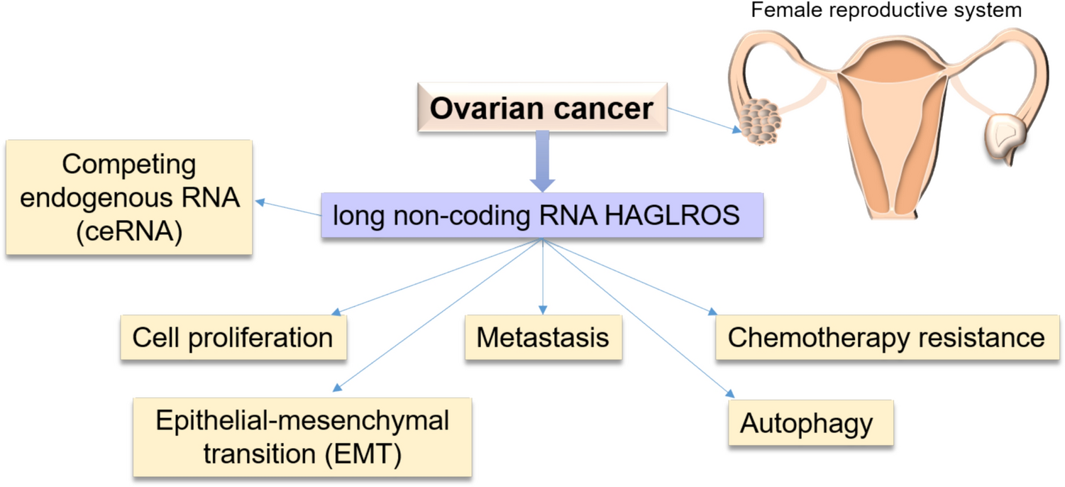 HAGLROS as a central oncogenic lncRNA by sponging tumor-suppressor miRNAs leads to the activation of autophagy, proliferation, and chemoresistance, thereby inducing pathogenesis in ovarian cancer.