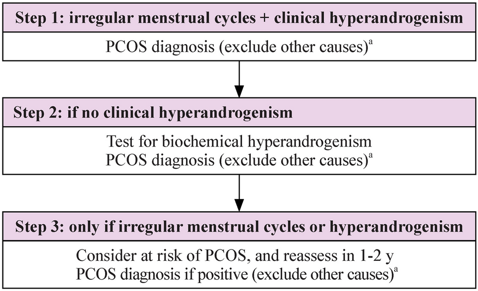Diagnosis of polycystic ovary syndrome (PCOS) in adolescence [2]. aExclusion of other causes requires testing thyroid-stimulating hormone, prolactin, 17-OH progesterone, and follicle-stimulating hormone. If clinical assessment is suggestive, then other causes need to be excluded (e.g., Cushing’s syndrome, adrenal tumors, etc.)