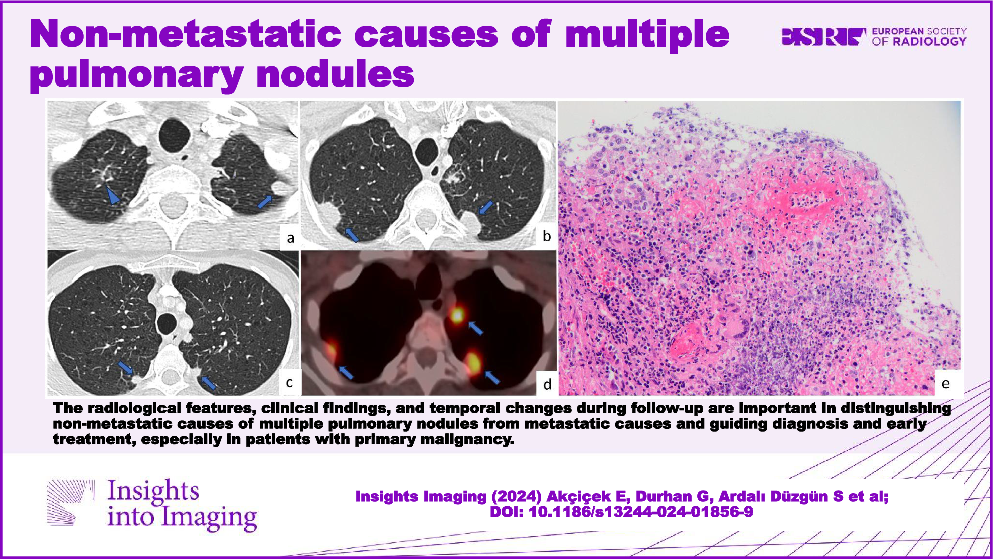 The radiological features, clinical findings, and temporal changes during follow-up are important in distinguishing non-metastatic causes of multiple pulmonary nodules from metastatic causes and guiding diagnosis and early treatment, especially in patients with primary malignancy.