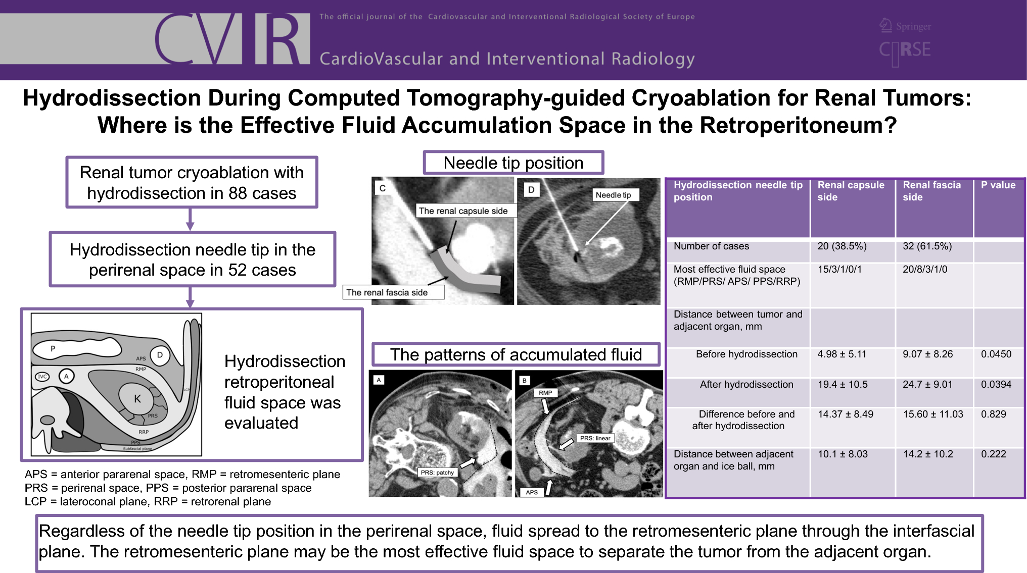Between March 2014 and March 2021, 52 renal tumors were treated by cryoablation with hydrodissection (36 men; mean age 72.5 years). The hydrodissection needle was located in perirenal space. The spreading fluid space based on the retroperitoneal anatomy with the interfascial plane was retrospectively evaluated. The fluid space that most effectively separated the tumor from the adjacent organs was defined. The relationship of the needle tip position in the perirenal space (renal capsule or fascia side) and the most effective fluid space was also evaluated.