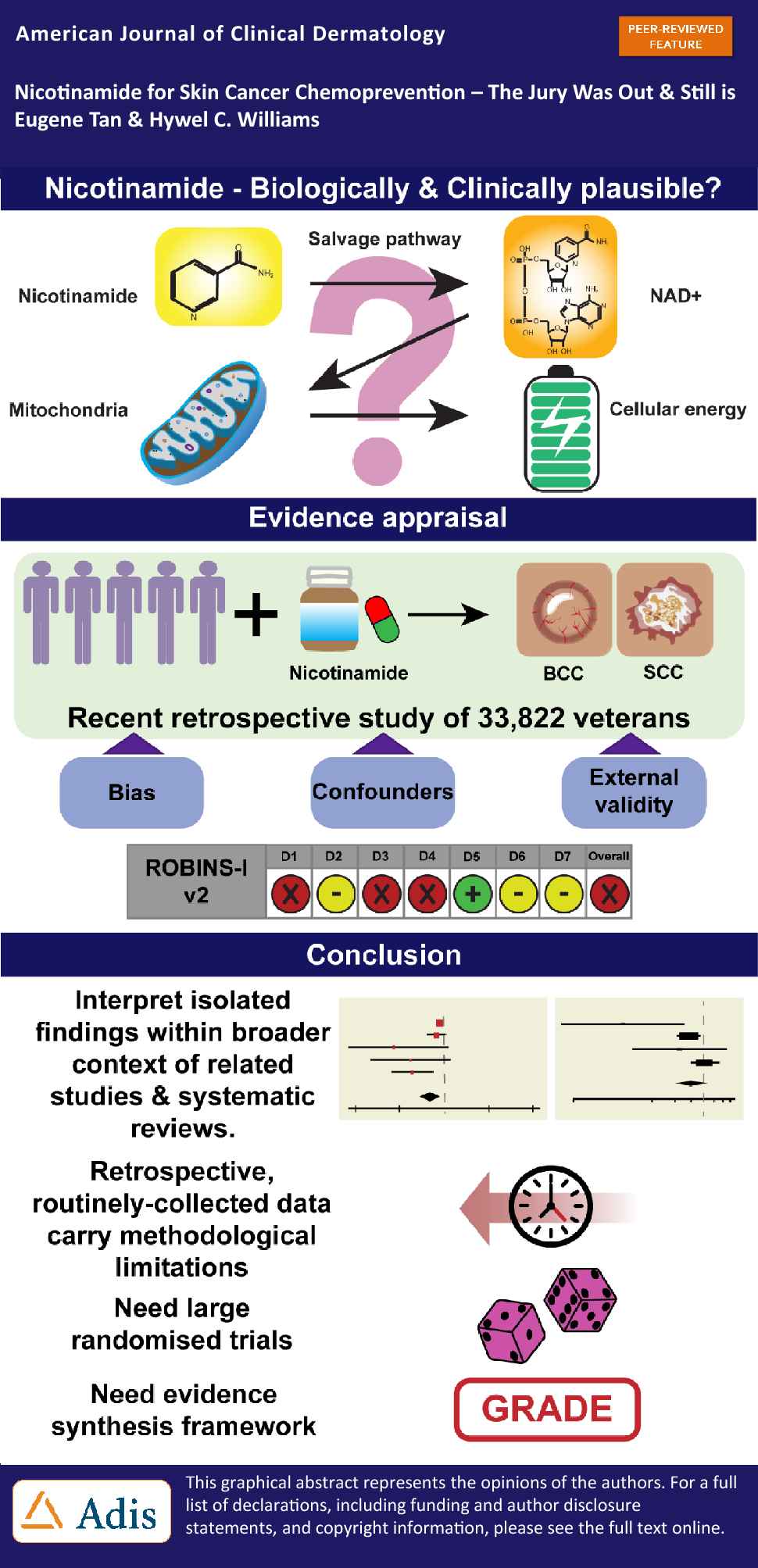 Nicotinamide has been widely promoted as a low-cost safe chemopreventive agent against non-melanoma skin cancer. A recent large retrospective study of more than 33,000 US veterans reported a 14% reduction in overall skin cancer risk and a 22% reduction in cutaneous squamous cell carcinoma with nicotinamide use, with greater benefit observed when initiated early. This critical appraisal identifies key methodological limitations of that study, including unmeasured confounders, immortal time bias, exposure misclassification, flexible analytical modelling and limited external validity. The findings are discussed in the context of two recent systematic reviews (2022 and 2023) to provide a balanced appraisal of the evidence and clarify whether nicotinamide should be recommended in routine practice. Current evidence does not yet confirm the chemopreventive efficacy of nicotinamide. Caution is warranted before its widespread clinical adoption—the jury, as it stands, is still out.