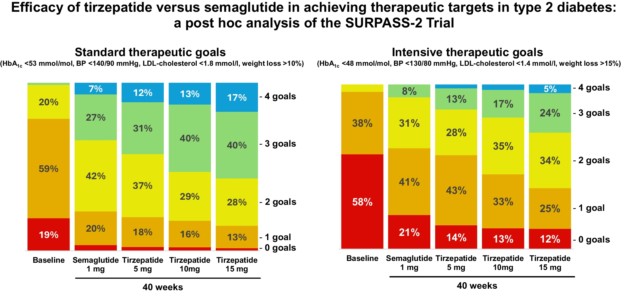 We performed a post hoc analysis of the SURPASS-2 trial, a randomised phase 3 study including 1879 adults with type 2 diabetes. Participants were randomised to receive tirzepatide (5, 10 or 15 mg) or semaglutide (1 mg). In this analysis, we compared the effects of tirzepatide vs semaglutide on the attainment of standard (HbA1c <53 mmol/mol [7%], BP <140/90 mmHg, LDL-cholesterol <1.8 mmol/l, >10% weight loss) and intensive (HbA1c <48 mmol/mol [6.5%], BP <130/80 mmHg, LDL-cholesterol <1.4 mmol/l , >15% weight loss) therapeutic targets at 40 weeks.