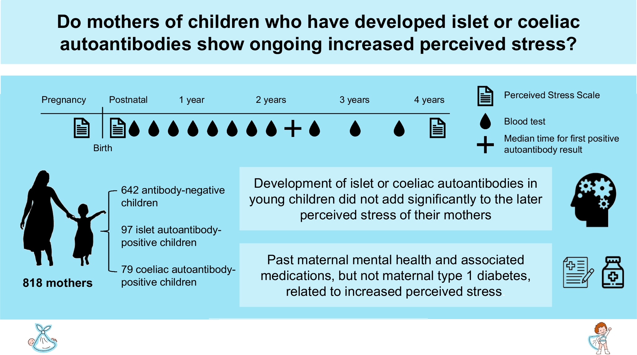 We aimed to assess perceived stress and influencing factors in mothers with children at risk of type 1 diabetes and coeliac disease who did, or did not, develop islet autoantibodies (IA) or coeliac autoantibodies (CA) by 4 years of age.