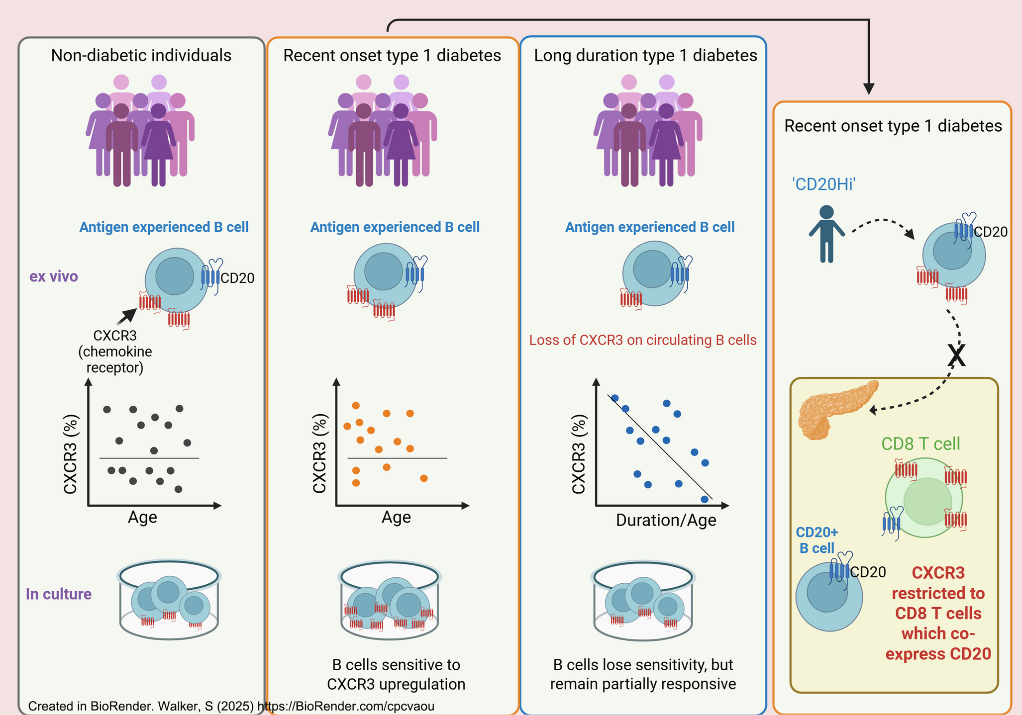 We observed reduced CXCR3 expression on antigen-experienced B cells in individuals with a long duration of type 1 diabetes, although B cells remained responsive to IFNγ. In individuals who were recently diagnosed, IFNγ treatment resulted in increased CXCR3 expression compared with B cells from non-diabetic donors. B cells in pancreases that were recovered post-mortem from young recent-onset donors lacked CXCR3 expression, but co-staining to detect CD8+ T cells revealed a CXCR3+CD20+CD8+ T cell population, with their circulating counterpart showing increased CXCR3 expression.