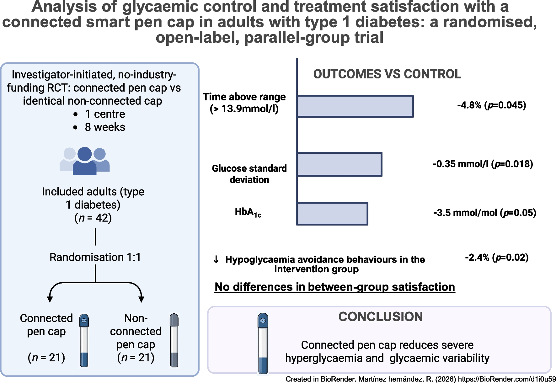 Connected insulin pens and smart caps automatically capture dosing data and can prompt patients about missed prandial boluses, but independent randomised evidence in type 1 diabetes is scarce. We aimed to assess whether a connected insulin pen cap improves glycaemic management and treatment satisfaction compared with an otherwise identical non-connected cap.